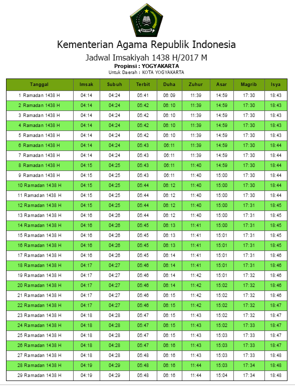 Berikut ini Jadwal Imsakiyah Puasa Ramadhan 2017 / 1438 H untuk daerah Yogyakarta